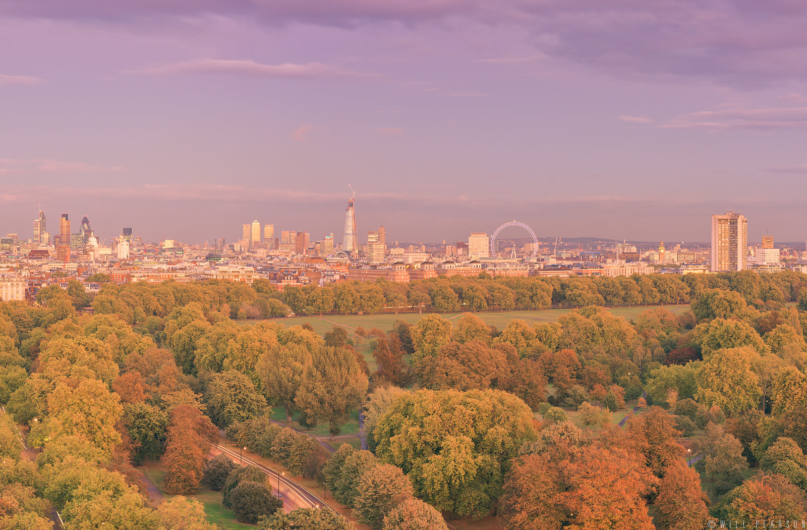Aerial London panorama by Hyde Park with views of the Serpentine, Albert Hall, Battersea Power Station, London Eye, the BT Tower, The Shard with the City of London and Canary Wharf in the distance.