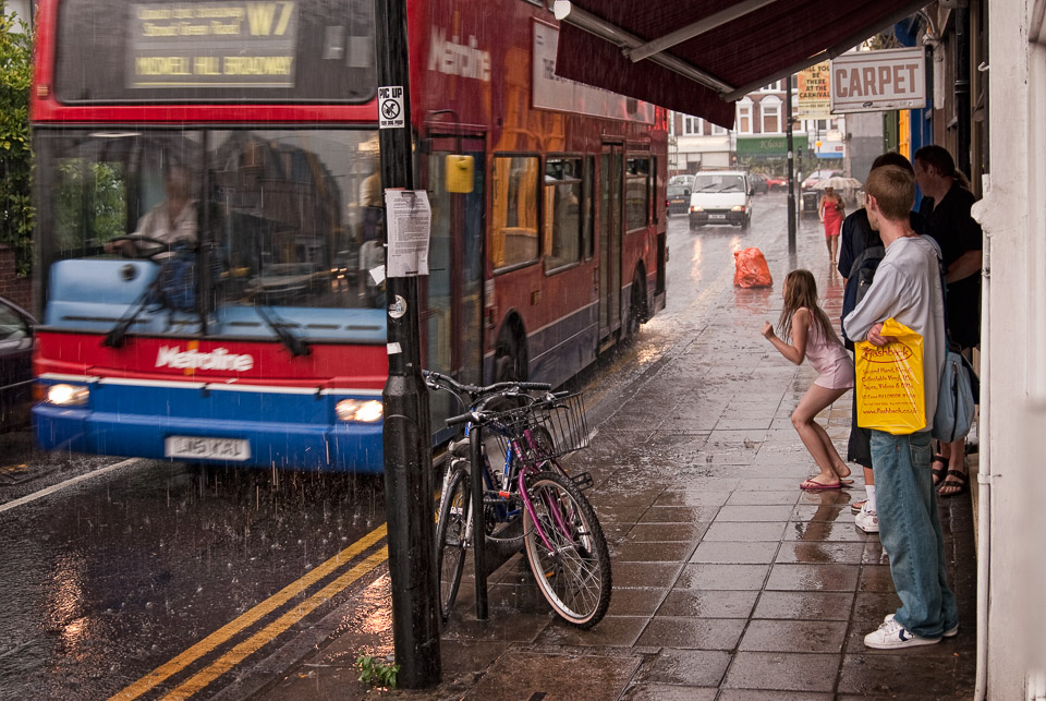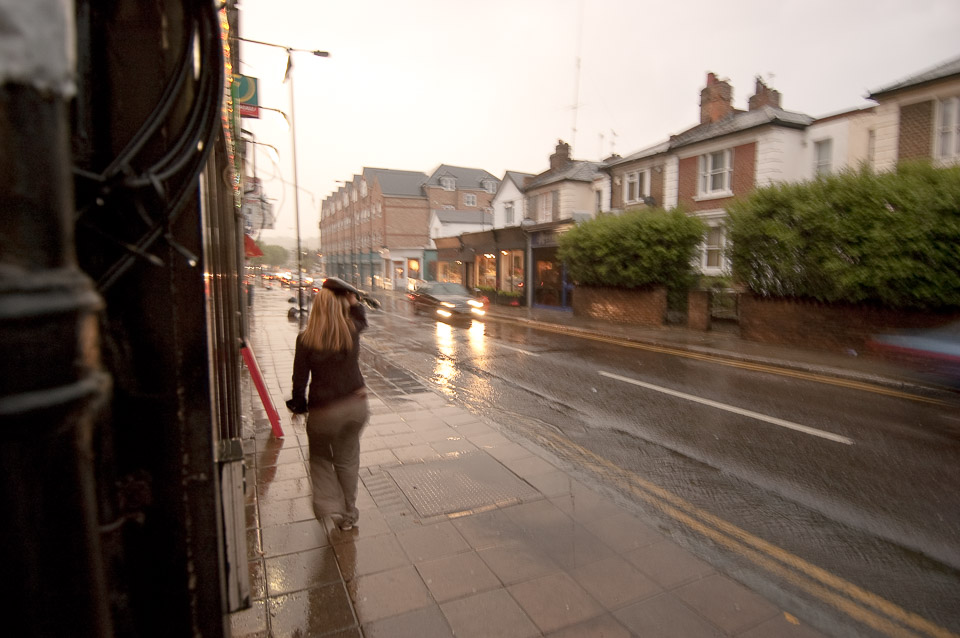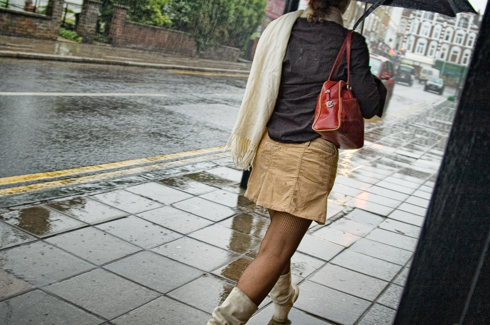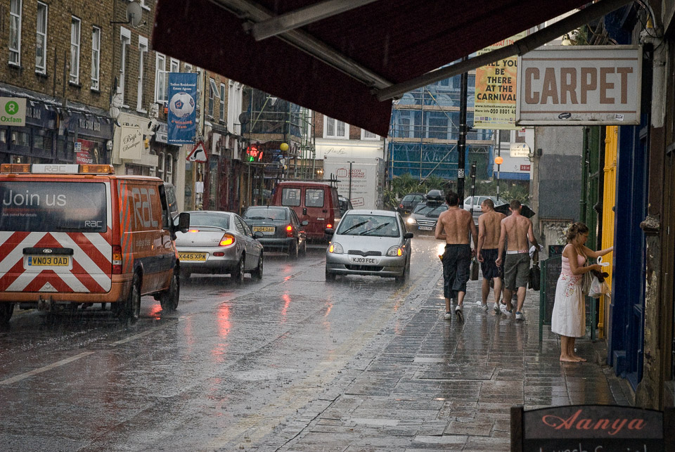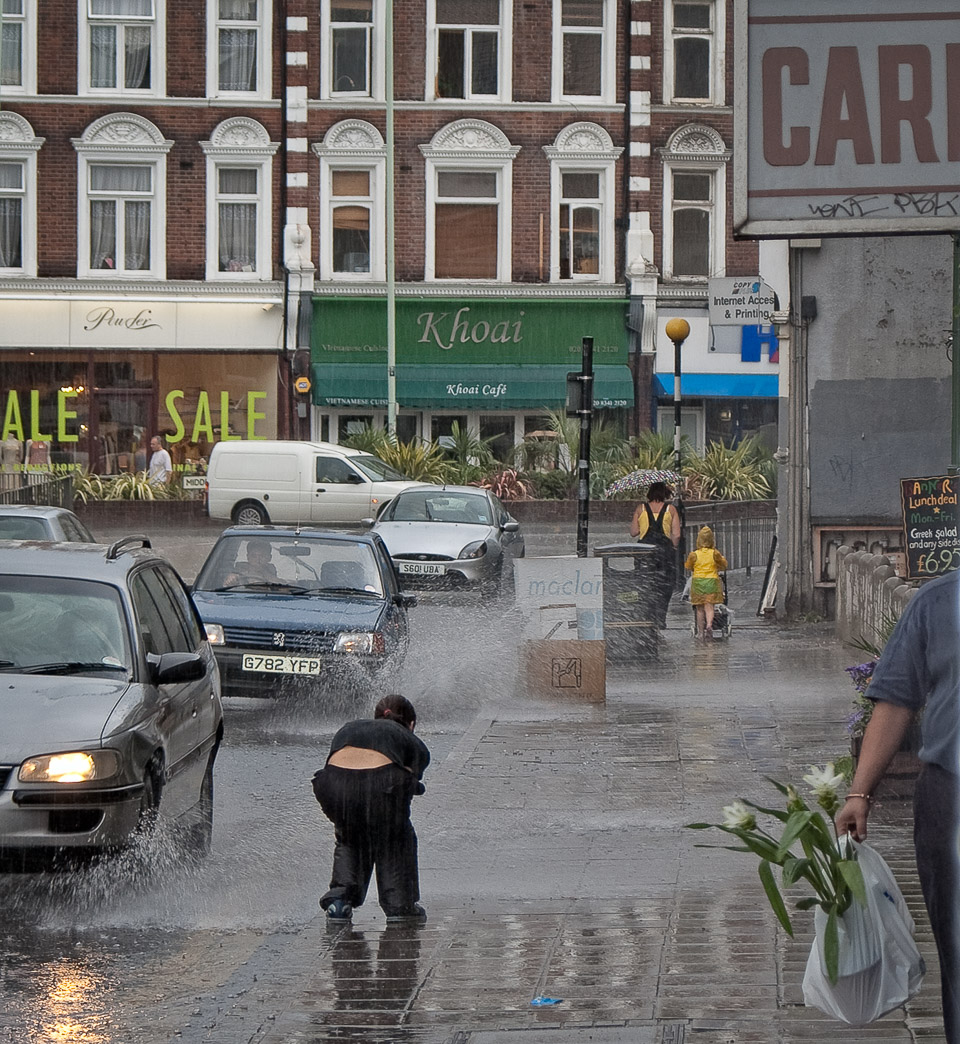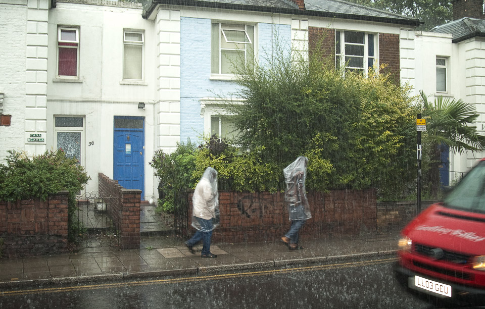 London occasionally sees unseasonal, almost tropical rain. For 8 years, my studio space was based on Park Road in Crouch End, North London, and on the rare occasions that this heavy rain showed up, I’d grab my camera and go to shoot the view outside. More than the views, it was the reactions that fascinated – this wasn’t your usual English drizzle, but downpours that found people wholly unprepared, scrabbling for a solution or just going with it and enjoying being soaked to the skin.