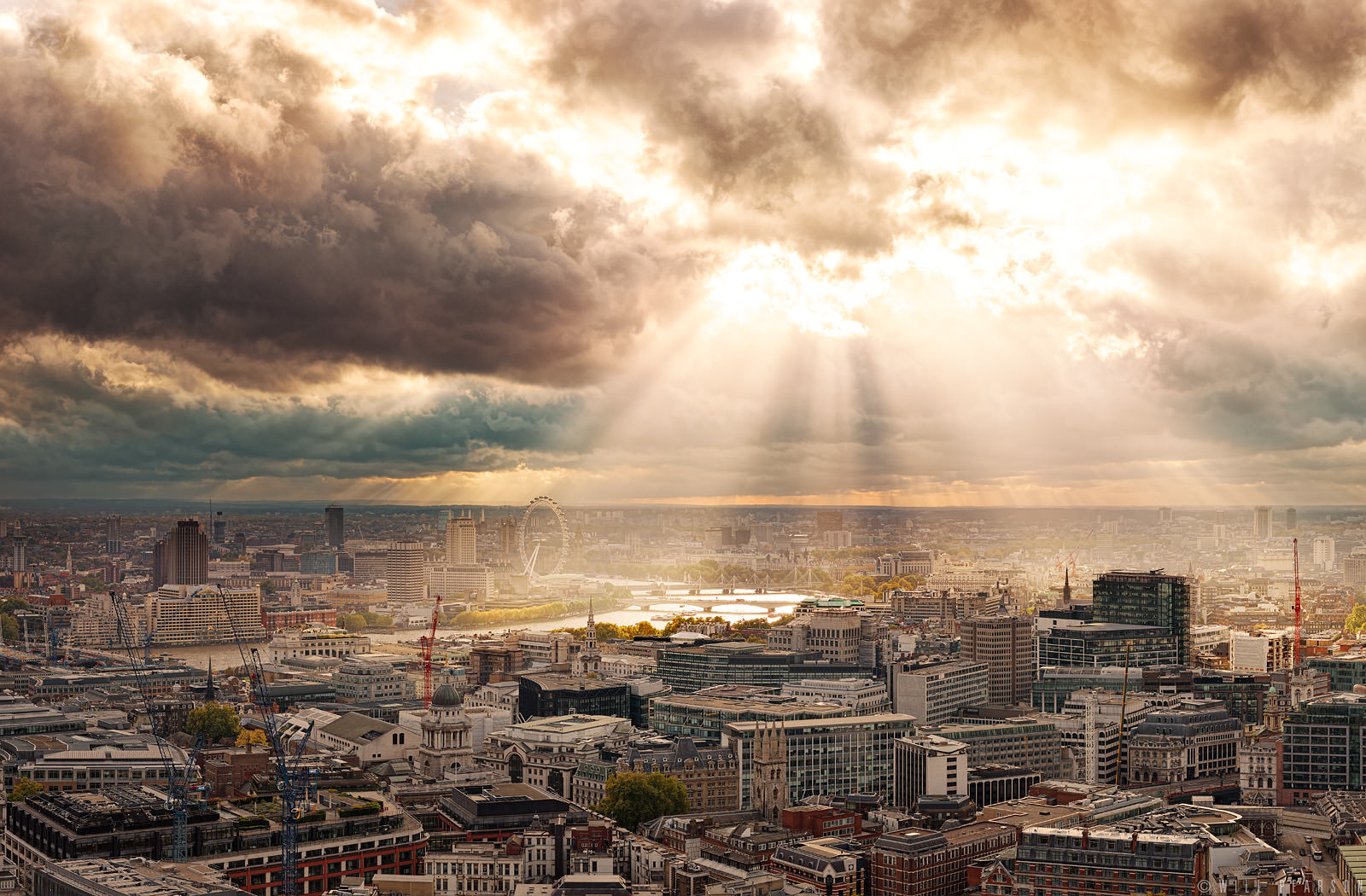 A dramatic panorama of London, looking up the River Thames past Waterloo Bridge, Hungerford Bridge towards Westminster. The Sun’s rays are bursting through a stormy sky, illuminating many of London’s well known landmarks. These rays are known as crepuscular and often appear in conjunction with stratocumulus storm clouds.